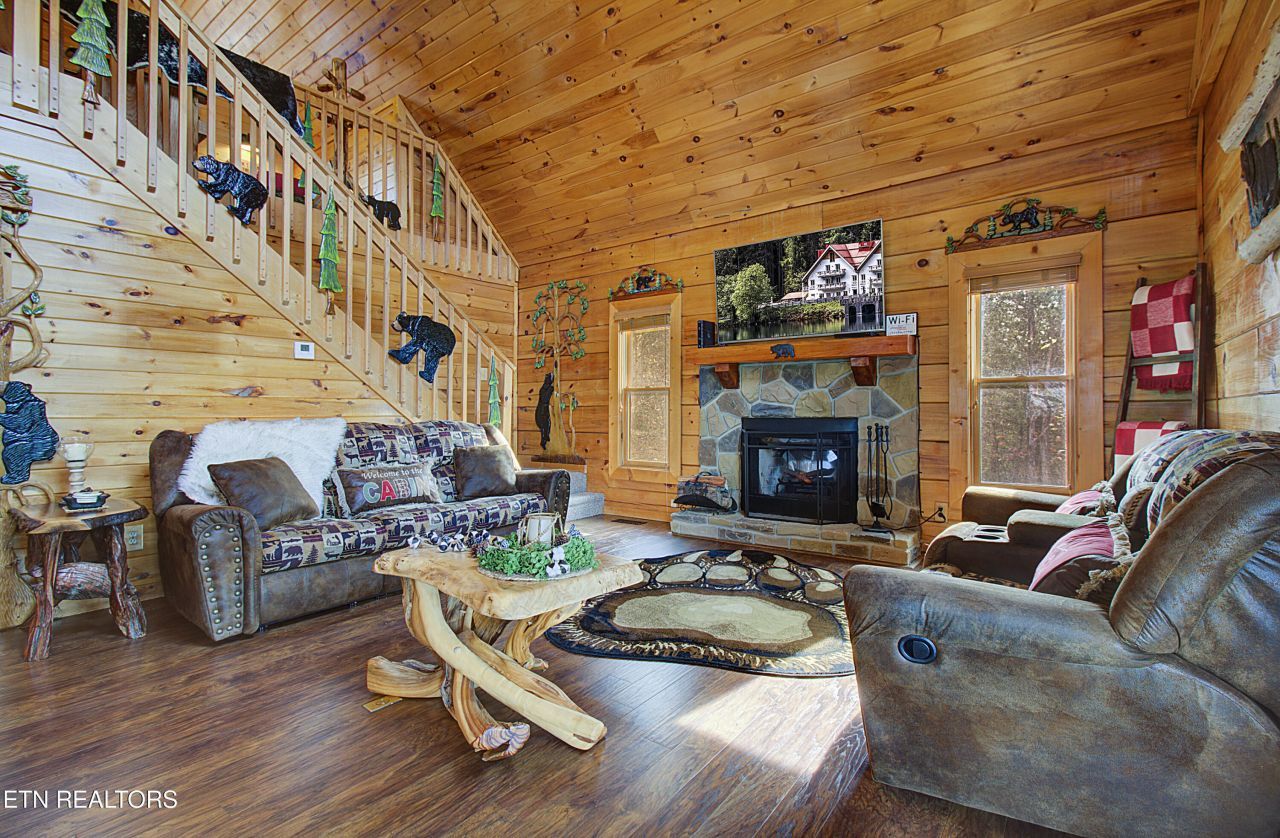 This fully furnished 2-bedroom, 2-bathroom cabin offers stunning mountain views and turnkey rental potential. Thoughtfully designed, it features $35,000 worth of custom bear-themed wooden art, a purified water system, and a water softener. The main level includes both bedrooms for convenience, while the loft comfortably sleeps four, perfect for families or groups. Located in Douglas Lake Resort, the property provides access to a seasonal pool, playground, boat ramp, docks, boat parking, clubhouse, event hall, and scenic walking trails-just downhill from the cabin. HOA fees cover these amenities along with garbage disposal and septic services. Complete with a spacious basement for added storage this cabin is a unique opportunity to own a high-performing rental in the heart of the Smoky Mountains.